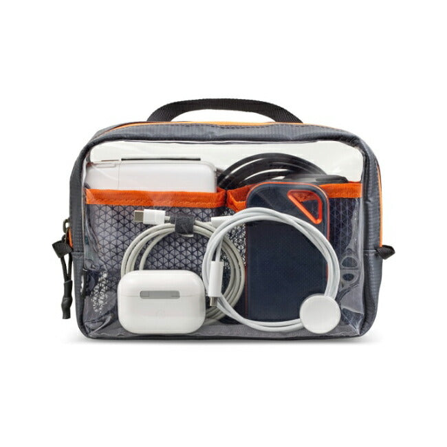 | トラベルラインアクセサリーの軽量収納ポーチ。 両面のクリアウレタン素材で収納しているものを確認しやすくなっています。 中は仕分けしやすいように、メッシュで区切られています。 【素材】 70D Recycled Robic Nylon 【重さ】 77g |