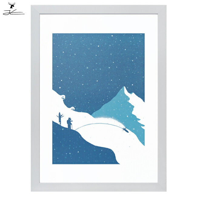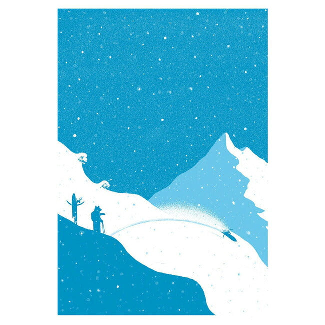 ジョナスが北海道を訪れ、スノーボードを体験した際に見た風景を描いた作品。 日本の雪山の美しい情景とジョナスオリジナルのキャラクターが可愛らしい1枚です。 |
