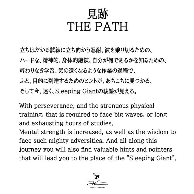 立ちはだかる試練に立ち向かう忍耐、波を乗り切るための、ハードな、精神的、身体的鍛錬 自分で何があるかを知るための、終わりなき学習 気の遠くなるような作業の過程で、ふと、目的に到達するためのヒントが、あちこちに見つかる。 そして今、遠く、Sleeping Giantの稜線が見える。With perseverance, and the strenuous physical training, that is required to face big waves, or long and exhausting hours of studies. Mental strength is increased, as well as the wisdom to face such mighty adversities. And all along this journey you will also find valuable hints and pointers that will lead you to the place of the "Sleeping Giant". |