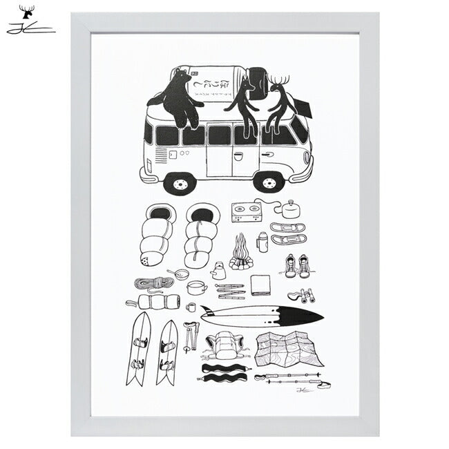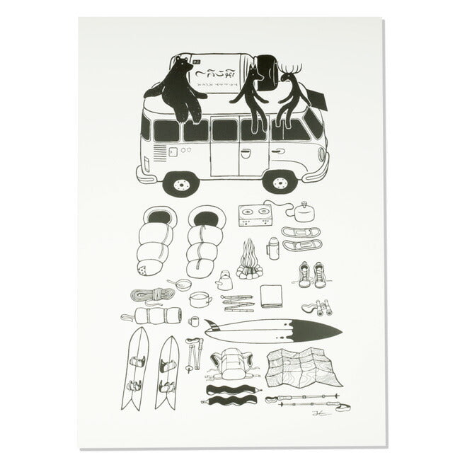 キャンプ旅行の前に、行き先目的に応じて、必要な道具をバンの前にひろげてチェックをしている風景が描かれた1枚。 その中の料理道具には、もちろん「ほりにしスパイス」を!というところを大きく描いたそうです。 |