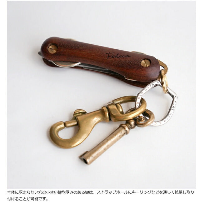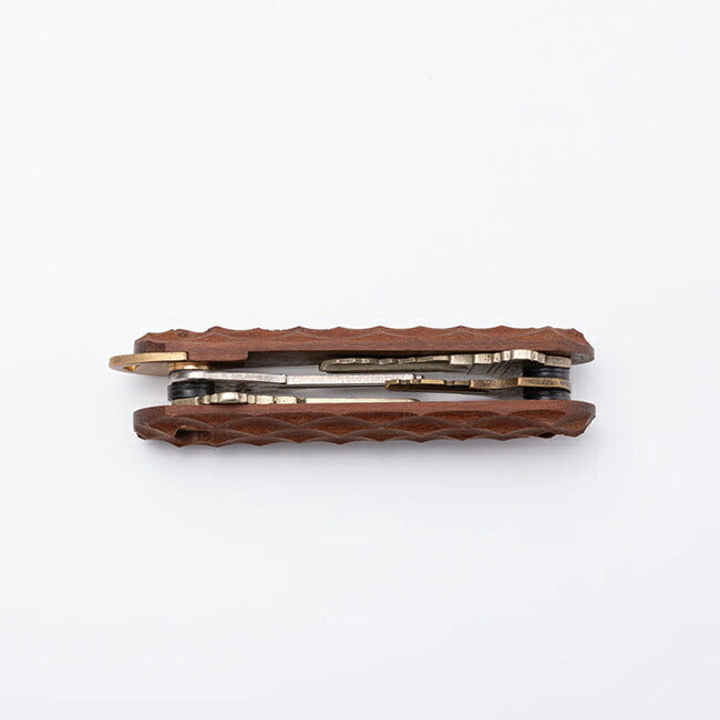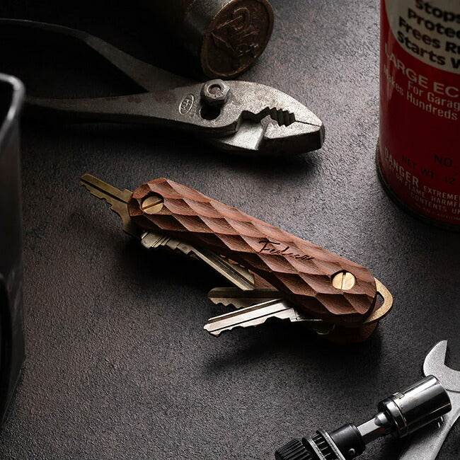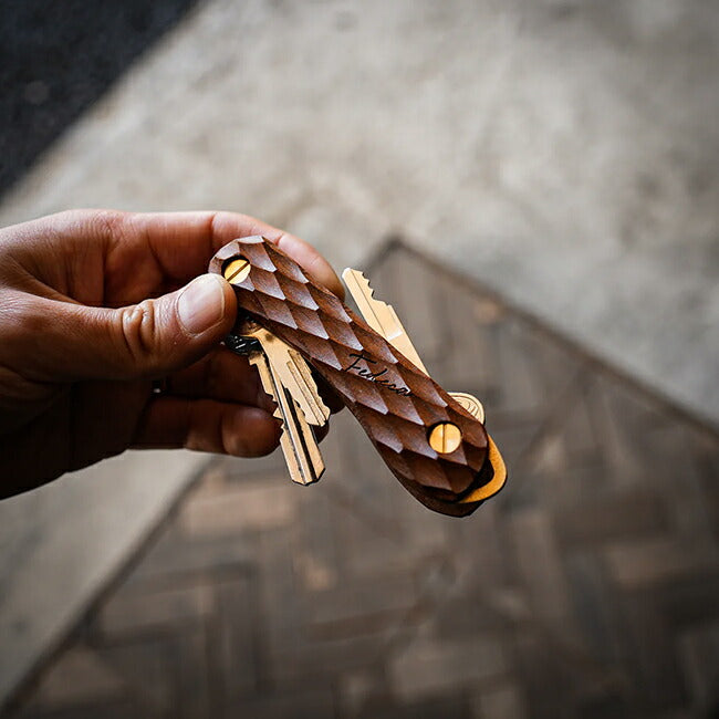 | 「ナイフの技術で、鍵を束ねる。」刃物ブランドFEDECAが仕掛ける「日常ギアのアップデート」 唯一無二の「造形美」と「ぬくもり」が融合。 ありそうでなかった、「毎日に寄り添う道具」を格上げするキーオーガナイザー ポケットの中でいつも触れるものだからこそ、心地よい質感にこだわりたい。 金属やプラスチックでは得られない、木のやわらかな手触り。 使うほどに風合いが深まり、ナイフのように手に馴染んでいく感覚。 ただ鍵を束ねるだけでなく、「毎日、触れたくなる心地よさ」を届けたいと思いました。 ポケットの中で、木のぬくもりにふれた瞬間に、FEDECAのものづくりの想いが伝われば嬉しく思います。 道具は、使う人の手の中で完成するもの。 ナイフのように美しく、そっと寄り添い、日々に豊かさをもたらすキーオーガナイザー。 あなたの毎日を彩る一本を、お届けします。 【カスタマイズ可能】 ネジを調整することで、鍵の追加や取り外しが簡単におこなえ、最大5枚まで収納可能。 鍵の厚みによって収納枚数は異なりますが、シンプルな操作でスムーズにカスタマイズできるため、日々の使い勝手が大幅に向上します。 【時とともに深まる風合い】 ハンドル材は使うほどに手に馴染み、真鍮は時とともに深みのある色合いに変化していきます。 定期的にオイルやワックスでメンテナンスすることで、さらに愛着が湧き、道具としての個性が増していきます。 こうして、持ち主と共に成長し、唯一無二の存在へと変わっていくのです。 時間とともに、より一層手に馴染み、使うたびにその魅力を感じることができるガジェットへと育っていくことでしょう。 【重量】 約30g 【仕様】 2〜4本の鍵の収納が可能。 鍵の厚みにより収納できる本数が異なります。 ※穴径4mm以上、全長70mm以下の鍵が装着可能。 |