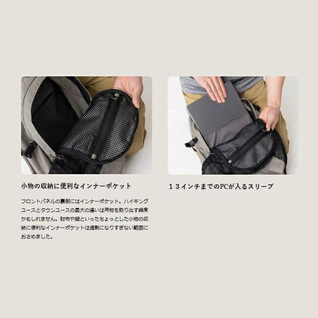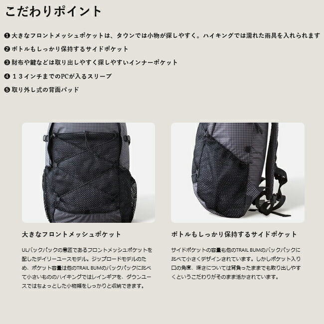 | オフィスから、トレイルへと、どこにでも連れ出せるデイパックスタイルのバックパック。 Bummerがハイキングシーンでもたらすシンプルさと機能性をデイリーシーンでも楽しめます。 背面パッドを外せば、折り畳んで出張や旅行などに携行できます。 週7日/24時間、どこにいてもハイキングスタイルを貫き通すデイパックです。 耐摩耗・耐衝撃性に優れる、超高分子量ポリエチレン繊維「スペクトラ」をリップストップにしたナイロン素材を使用したバージョン。 【こだわりポイント】 ・大きなフロントメッシュポケットは、タウンでは小物が探しやすく。 ハイキングでは濡れた雨具を入れられます。 ・ボトルもしっかり保持するサイドポケット ・財布や鍵などは取り出しやすく探しやすいインナーポケット ・13インチまでのPCが入るスリーブ ・取り外し式の背面パッド 【重量】 450g 【容量】 18〜20L 【素材】 本体:ナイロン、ポリエチレン メッシュ:ポリエステル |