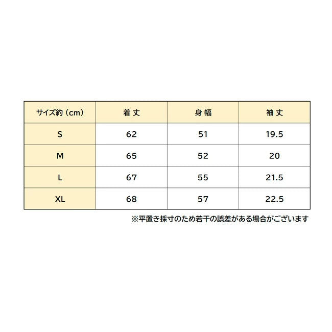 サイズ | S:着丈約62 身幅約51 袖丈約19.5 M:着丈約65 身幅約52 袖丈約20 L:着丈約67 身幅約55 袖丈約21.5 XL:着丈約68 身幅約57 袖丈約22.5 (単位:cm) ※平置き採寸のため若干の誤差がある場合がございます。あらかじめご了承ください。 |