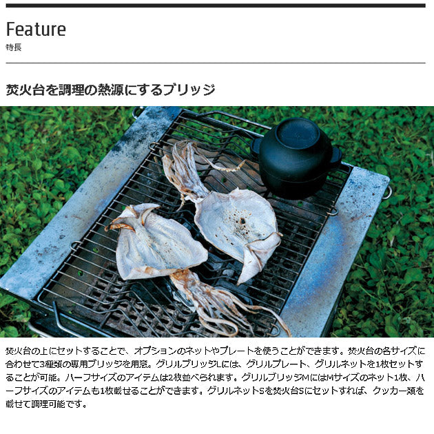 焚火台LにグリルブリッジLをセットすることで、グリルネットやグリルプレートなど調理用オプションを使うことができます。