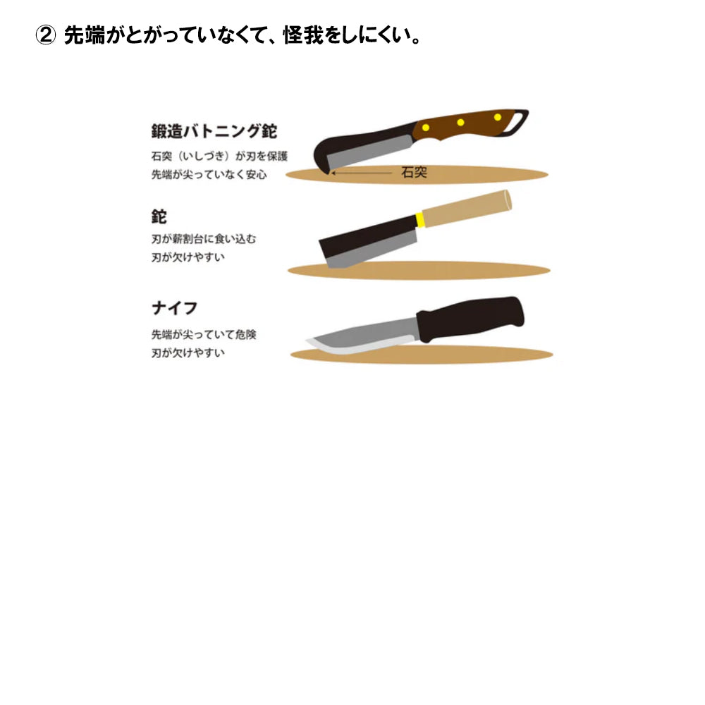 鍛造バトニング鉈では先端が尖っておらず丸みを帯びているので、怪我をするリスクが少ないのも安心です。