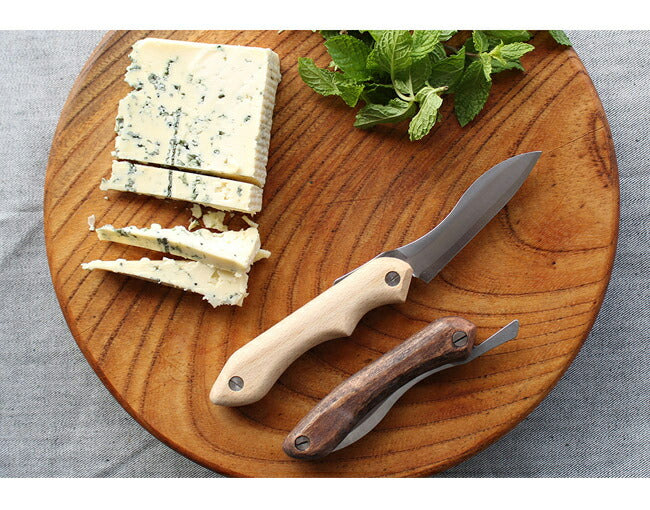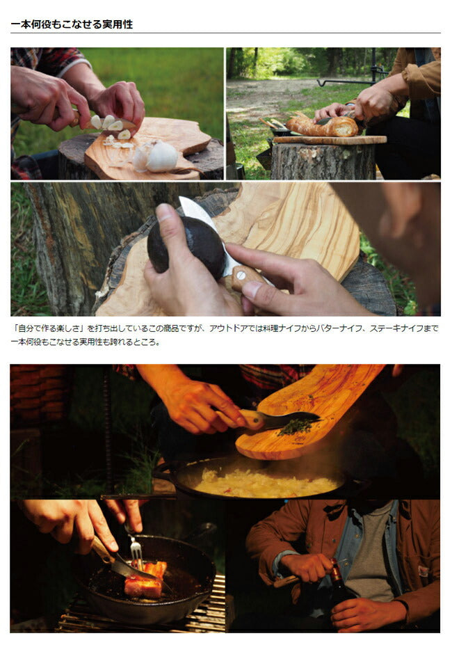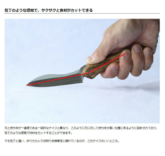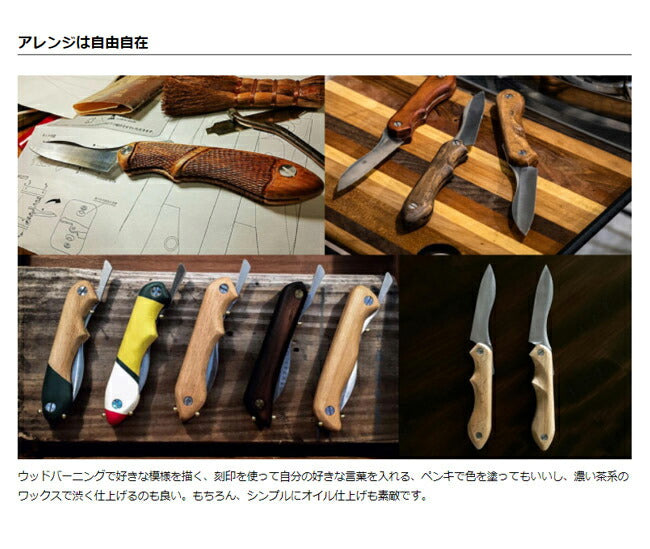 アウトドアでの調理シーンを想定して開発されたこのナイフ、 ハンドルを作り上げる楽しさはもちろん、使い勝手も細部まで工夫が施された 本格派の折りたたみナイフです。