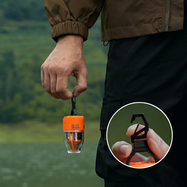 ・カラビナフック、三脚取付け用アタッチメント付き。