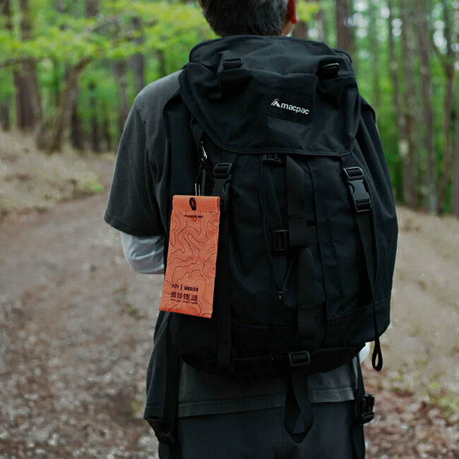 フラットなポーチ型で邪魔にならず、バッグの中に入れておいたり、カラビナで取り付けることも可能。