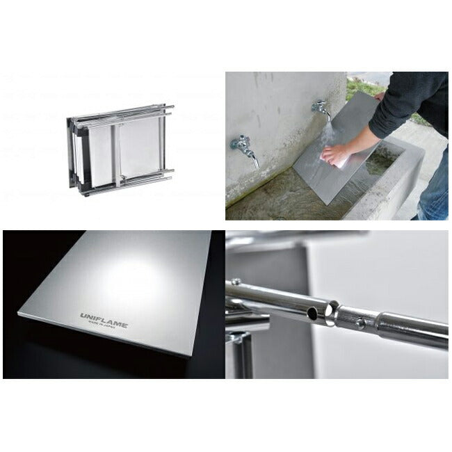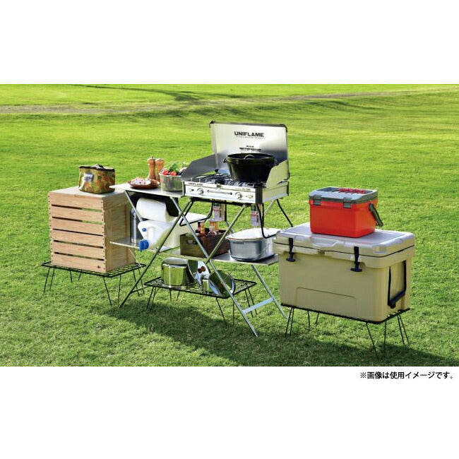 さらなるコンパクト収納を実現したキッチンスタンドIII 材質 フレーム:鉄・クロームメッキ 天板・棚板:ステンレス鋼 重量:約5.8kg 棚板分散耐荷重 片側あたり:約15kg |