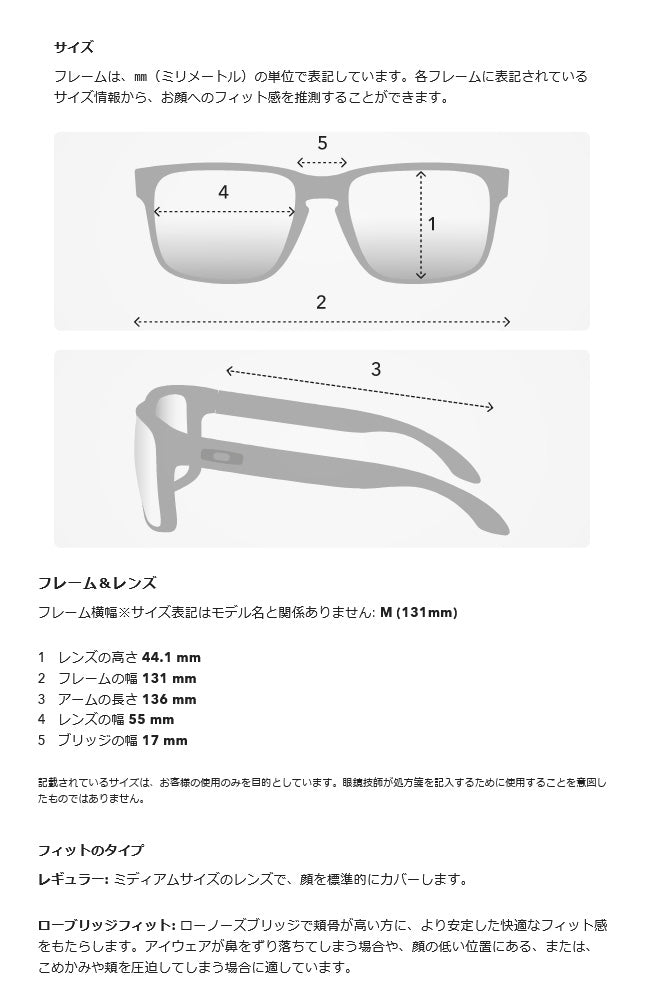 | サイズ | ローブリッジフィット(アジアンフィット) サイズ:M(131mm) 1 レンズの高さ:44.1mm 2 フレームの幅:131mm 3 アームの長さ:136mm 4 レンズの幅:55mm 5 ブリッジの幅:17mm ※1・2・3・4・5の採寸目安は画像で確認お願いします。 ※メーカーサイズ参照 |