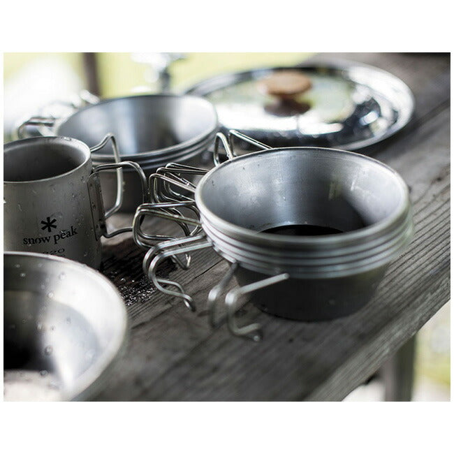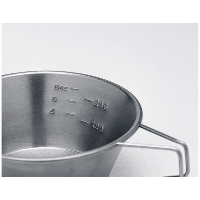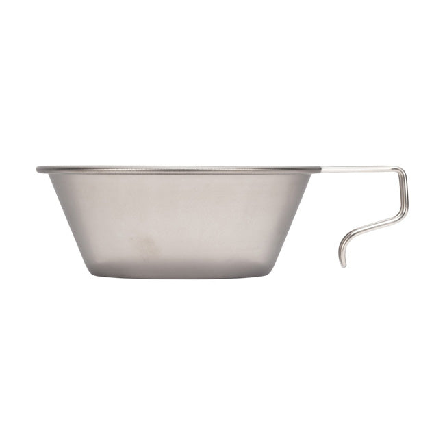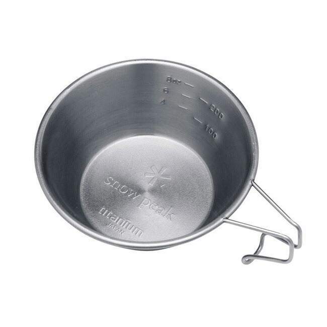 | さまざまな使い方ができるシェラカップ。 チタン製で超軽量です。 アウトドアの定番、シェラカップ。 コップやお皿、計量カップの代わりとして使うことができる万能アイテムです。 重ねられるので、収納や携帯にも便利。 指に掛かりやすいハンドルのため、持ちやすいのがうれしいポイントです。 チタン製のため驚くほど軽量です。 強度があり光沢が美しいステンレス製のシェラカップも用意しています。【重量】 37g 【容量】 310ml 【材料】 チタニウム |
