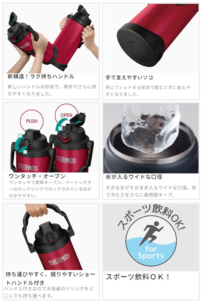 | 新構造!ラク持ちハンドルでより持ちやすく、スポーツシーンに最適な大容量のジャグです。 大容量のスポーツジャグは、真空断熱構造だから長時間のスポーツシーンでも冷たさキープ。 しっかり握れる新構造のラク持ちハンドルで、飲むときにさらに持ちやすくなりました。 大きな氷がそのまま入るワイドな口径、氷で冷たさをさらに長時間キープ。 スポーツ飲料OK! 【実容量】 3.0L 【保冷効力(6時間)】 9℃以下 【口径(約)】 7.4cm 【本体重量(約)】 1.2kg |