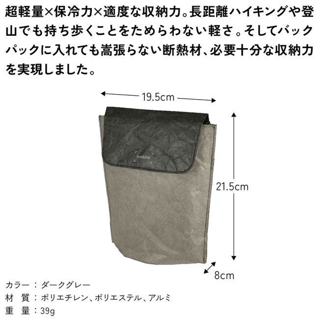 | 超軽量×保冷力×適度な収納力を実現したソフトクーラー ●長距離ハイキングや登山でも持ち歩くことをためらわない軽さ、そしてバックパックに入れても嵩張らない断熱材、必要十分な収納力を実現しました。 ●350ml缶を3缶、500mlペットボトルを2本収納可能。 ●冷たい空気を逃がしにくくするインナーフラップ。 ●背面には持ち運びしやすいハンドル付き。 【重量】 39g 【材質】 ポリエチレン、ポリエステル、アルミ |