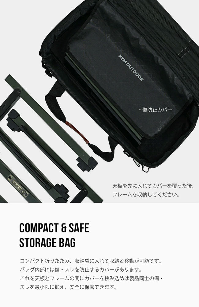 | 丈夫なアルミ素材のフィールドトップテーブルS。 天板とフレームが分解でき、コンパクトな収納が可能です。 揺れを最小限に抑えるためのフレーム結合方式を採用しており、安定して使用できます。 また、手軽な操作方法で3段まで高さ調節が可能で活用性の良いキャンプテーブルです。 【重量】 3.15kg 【耐荷重】 30kg 【材質】 アルミニウム、PP 【商品内容】 本体、キャリーバック 【KZM OUTDOOR】 2008年に韓国のキャンプブランドとして誕生 「KZM」の由来 ・K- ドイツ語のKamping(キャンプ)を ・AZ- AからZ(始まりから終わり)まで ・MI- 美しくしよう |