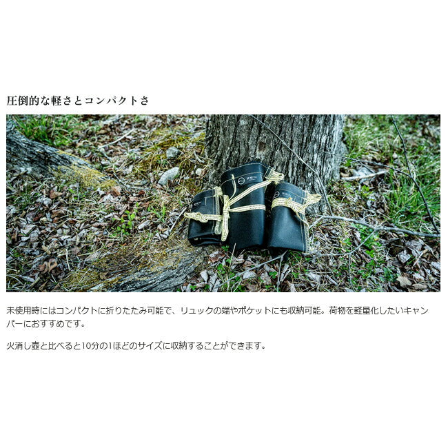 | ZEN Campsのアッシュキャリーは非常にコンパクトでありながら丈夫で耐熱性の高い火消し袋です。 汎用性も高く、火消し袋以外にも様々な用途で使用することができます。 Lサイズ(34cm×38cm)は最も大きなサイズで、連泊や大人数のキャンプ、BBQで大量の炭や薪を使用する場合に活躍します。 【熱が残る炭や薪を収納できる高い耐熱性と密閉性】 耐熱性が高いガラス素材と特殊なシリコンコーティングにより、まだ鎮火していない炭や薪の燃えカスを安全に投入可能。 耐熱温度は550℃と非常に高温に強いので、袋自体が燃えることはありません。 ※ただし火消し壺とは違い、炎が燃え上がった状態の炭や薪を投入すると、袋が傷つき穴が空いてしまう可能性がありますのでご注意ください。 密閉性が高くなるように縫製を採用しているため、袋の中で酸欠を起こし安全に鎮火を促すことができます。 紐または付属のカラビナを引っ掛けるだけなので手間なく収納できます。 【圧倒的な軽さとコンパクトさ】 未使用時にはコンパクトに折りたたみ可能で、リュックの端やポケットにも収納可能。 荷物を軽量化したいキャンパーにおすすめです。 火消し壺と比べると10分の1ほどのサイズに収納することができます。 【自立可能で広いマチ】 アッシュキャリーの底には手で広げられるマチがついているため、自立させて使用することが可能です。 両手が空くため焚き火台や焚き火シートから燃えカスを入れるのも楽になります。 【マットな質感と汚れても丸洗い可能なシリコン加工】 特殊なシリコンコーティングにより非常にマットな色合いと滑らかな質感を実現しています。 また、撥水性が高く汚れても丸洗いできるため、綺麗に長く、そして愛着を持って使用していくことができます。 【素材】 ガラス繊維(シリコンコーティング)、アラミド糸 【瞬間耐熱温度】 約1500℃ ※瞬間的に耐えられる温度 【耐熱温度】 約550℃ |