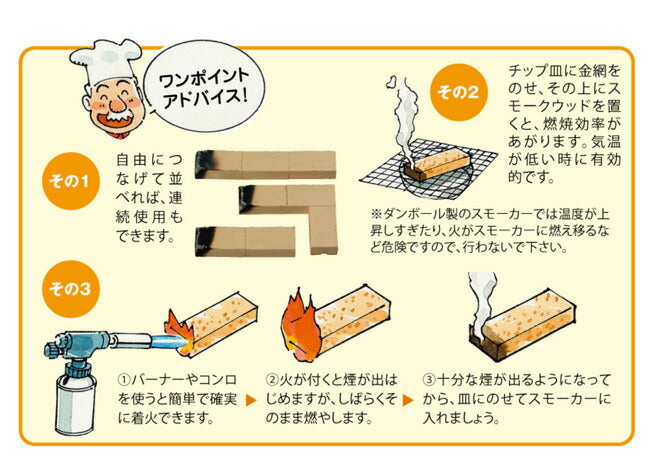3個の断面を連結させて置けば連続約5時間の燻煙が可能です。 ※熱源不要な燻煙材です