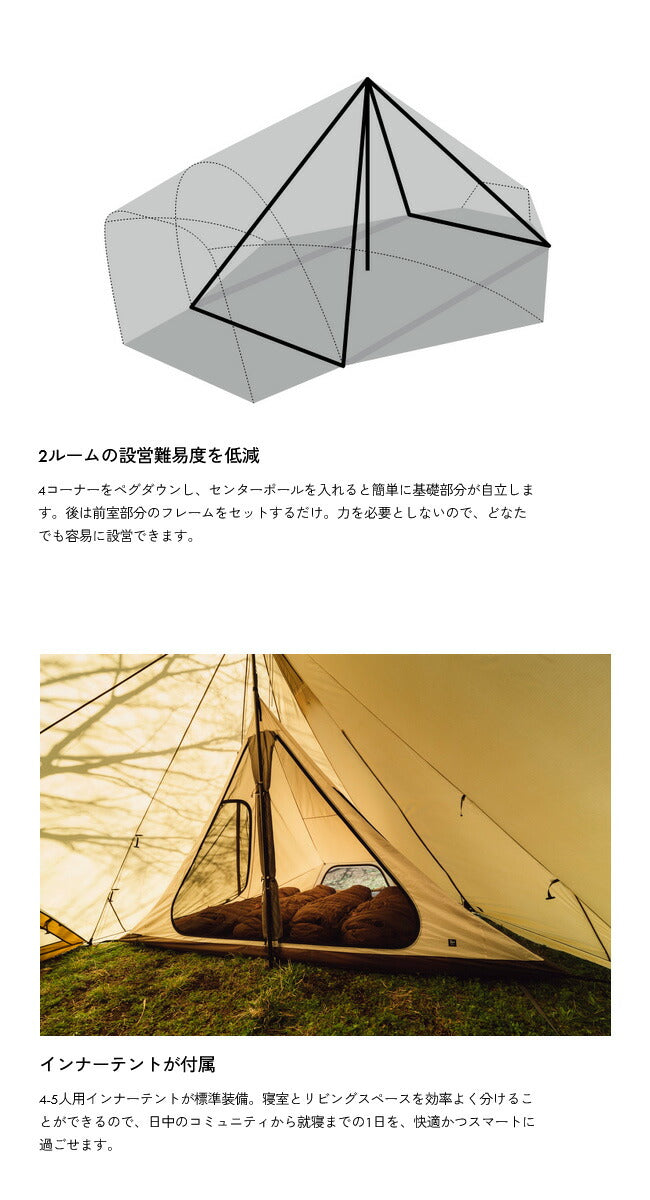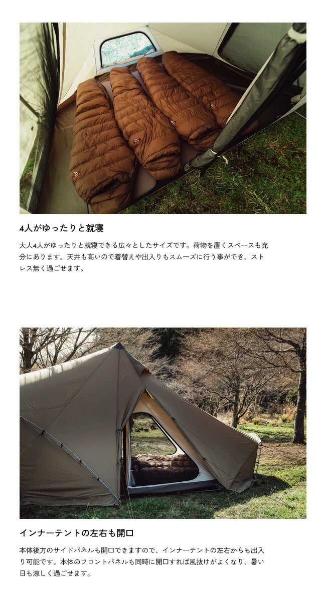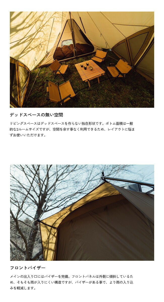 ワンポールとフレームワークを組み合わせた新しいスタイルの2ルームシェルター。 ワンポール構造により設営の簡便さと、広い空間面積を実現。 フロントパネル跳ね上げてタープとしても利用可能。 【本体】 75Dシリコーンポリエステルリップストップ・遮光PU加工 (耐水圧1,500mm) 【インナーテント】 ウォール:68Dポリエステルタフタ ボトム:150Dポリエステルオックス・PU加工 (耐水圧1,500mm) 【センターポール】 A6061 / φ32mm / 全長285cm 【フレーム一式】 A6061 / φ14.5mm・φ16mm・φ17.5mm 【3mロープ】 ポリプロピレン / φ4mm 【2mロープ】 ポリプロピレン / φ4mm 【キャリーバッグ】 150Dポリエステルオックス / 75×35×35(h)cm 【ポールケース】 150Dポリエステルオックス 【ロープケース】 150Dポリエステルオックス※視認性を高めるため、付属のロープカラーはブラックから、反射入りのアイボリーに変更になっています。 【撥水剤について】 一般的な撥水剤に含まれる物質・PEOA(ペルフルオロオクタン酸)が、環境中に分解されにくく、また高い蓄積性である有害物質であることから、ゼインアーツで使用している撥水剤は、有害物質が含まれていないものに変更いたします。 (現状、本体に関してはシリコーン加工前に下地剤として有害物質が含まれるフッ素を使用しております。) |