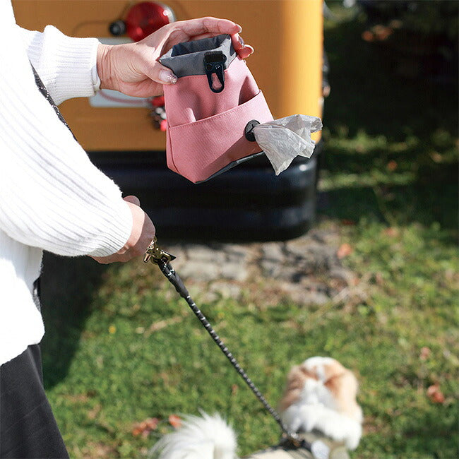 消臭・抗菌加工が施されたポリエステル生地を使用しているため衛生的に保つことができ、また片手で簡単に開閉できるバネ口を採用しているので、忙しいお散歩中でもスムーズにご利用いただけます。