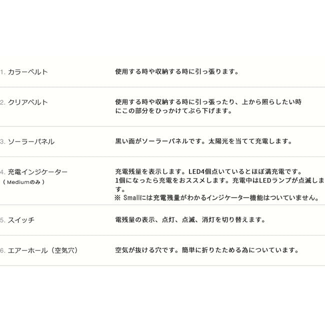 太陽の恵みをコンパクトな明かりに。 ソーラー充電式、携帯型軽量LEDランタン「CARRY THE SUN」 エコなソーラー充電 ・乾電池不要でゴミも出しません ・充電は直射日光に当てるだけ。 電気も使わないのでとってもエコ。 ・ソーラー充電で節約・節電 軽量&コンパクト ・畳むと約1.2cmに収納可能。 スマホと同じくらいの薄さと大きさです。 ・軽くて持ち運びにとても便利です。 素材について ・糸を織り込んだ丈夫なヨットのセイル生地を使用 ・耐UV糸を使用した丈夫な縫製 ・防水防塵仕様「IP67」取得済 ・JIS規格準拠落下テスト実施 使い方いろいろ、アウトドアから日常、非常時まで ・プロのアルピニストも使用する本格仕様 ・日常の移動可能なインテリアライトして、常夜灯や玄関やお風呂で。 ・「ながら防災備品」として普段使いしながら「いざ」の停電の備えにもなります。 ・家族やお友達へのギフトととしても喜ばれます。 【素材】 PET 【重量】 57g 【電源】 ソーラー充電式、リチウムポリマー電池 【仕様】 LED6灯 【明るさ】 強/30ルーメン、弱/15ルーメン 【耐水性】 IP67 【点灯時間】 強/10時間、弱/15時間 【充電時間】 5〜7時間(天候や季節によっては7時間以上かかる場合があります) ※スモールサイズには充電残量がわかるインジケーター機能はついていません。 |