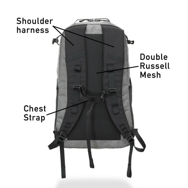 日常の延長にある小さな冒険を、より自由に楽しめるように。 ちょっとした買い物や仕事帰りの寄り道はもちろん、週末の近郊トレイルでの休憩、川辺でのピクニック、展望スポットまでの散策にも、自然に馴染みます。 もちろんハイキングにも。 バックパックの内部には、使いやすさを考慮した2つのポケットを設けています。 必要なアイテムを適切に収納できるように設計されており、整理もしやすいです。 フロントの上部には、小物を収納するのに便利な小さなポケットを設けています。 鍵やイヤホン、財布など、すぐに取り出したいアイテムを収納するのに最適です。 さらに、キーフックテープが付いているため、鍵をしっかりと固定でき、バックパックの中で迷子になる心配がありません。 背面には、ノートパソコンやハイドレーションシステムを収納できるポケットを備えています。 MacBook 13インチおよび14インチが収納できるサイズで、パソコンの出し入れをスムーズに行えるように設計されています。 使用素材には「210D ROBIC リップストップナイロン」を採用しています。 高い耐久性と軽量性を兼ね備え、摩耗や引き裂きに強い素材を使用しています。 パックの「かなめ」とも言えるショルダーストラップは、その素材選びと構造に徹底的にこだわっています。 表生地には420D ROBICリップストップナイロンを採用しています。 420D ROBICは、基本的な正方形グリッドのリップストップパターンに、超高強度で耐久性に優れたROBICナイロン6を組み合わせた生地です。 この素材は通常のナイロンよりも引き裂き強度と耐摩耗性に優れており、過酷なアウトドア環境でも安心して使用できます。 生地の表面にはDWR(耐久撥水加工)が施されており、雨や水しぶきをしっかりと弾く性能を備えています。 裏面には、従来のPUコーティングとは異なるUTS(Ultra Tear Strength)コーティングが採用されており、この特殊なコーティングは引き裂き強度を大幅に向上させるだけでなく、湿気の多い環境でも加水分解を起こしにくいという優れた特性を持っています。 そのため、耐久性においても非常に信頼性の高い素材となっています。 ショルダーストラップの芯材には、反発性、弾性、復元性、耐候性に優れた厚さ10mmのEVAフォームを採用しています。 この芯材は、肩に適度な「粘り気」を持たせることで、重さを効果的に分散し、肩への負担を軽減するように設計されています。 そのため、長時間の使用でも快適さを損なうことなく、しっかりとサポートします。 さらに、ショルダーストラップの裏面と背面部分にはダブルラッセルメッシュを使用しています。 この通気性に優れたメッシュ素材は、汗によるべたつきを軽減し、長時間の使用でも快適さを維持します。 背面には、背負い心地を向上させるための7mm厚のEVAフォームパッドが内蔵されています。 この背面パッドは、簡単に取り外しが可能です。 例えば、テント場で休憩する際や、冷たい岩や地面に直接座りたくない時などです。 このパッドをすぐに取り出して簡易クッションとして利用することで、寒さや湿気を気にせず、より快適に休憩を楽しむことができます。 【重量】 約464g 【容量】 約16L 【素材】 <本体部分>(UltraWeave Ultra100X) 表面:超高分子量ポリエチレン 52%、ポリエステル 48% 中糸:超高分子量ポリエチレン 100% 裏面:ポリエステルフィルム 100% ファスナー:YKKのAquaGuard NATULON コイルファスナー 5号 フロント、サイドポケット:ナイロン66 68%、超高分子量ポリエチレン 21%、ライクラファイバー 11%(UltraStretch) 内ポケット部分:ナイロン 100%(210D ROBIC Ripstop Nylon) <ショルダーハーネス部分> 表面:ナイロン 100%(420D ROBIC Ripstop Nylon) 芯材:10mm厚EVAフォーム 裏面:ポリエステル 100%(ダブルラッセルメッシュ) |