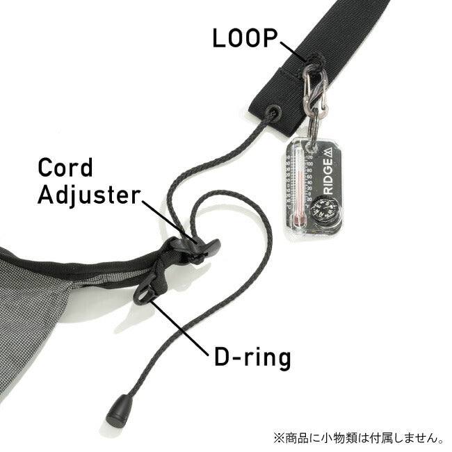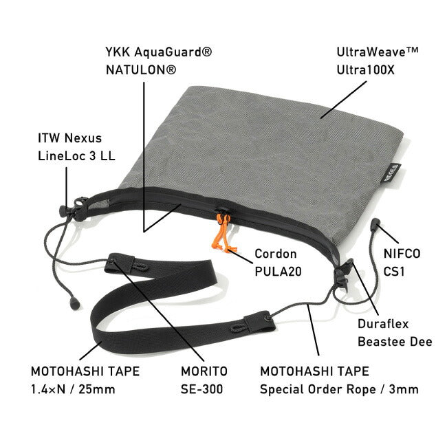 懐かしさと新しさが交錯するこのプロダクト ウィンドシェル・グローブ・ウォレット・イヤフォン・500mlペットボトル・サングラス・鍵・スマートフォン等、ハイキング行動中に必要な、サッと取り出したいアイテム等が収納可能です。 ファスナーはYKK AquaGuard NATULON コイルファスナー 3号を採用しています。 アクアガードはテープの表面をポリウレタンフィルムでラミネートし、止水性を持たせる処理を施したファスナーです。 撥水性に優れた特殊加工が施されたファスナーで、軽い雨や水しぶきなどがかかる状況でも内部をしっかりと保護します。 本体ポケット内部には鍵や小物が引っ掛けられるフックが内蔵されています。 ショルダーテープ部分には、温度計やコンパス、ホイッスルなどの小物アクセサリーを取り付けられるループを設けています。 山の中でさっと確認したいギアを、アクセスしやすい場所にセットできるため、移動中や立ち止まることなく行動しながらの確認が可能です。 また、コードアジャスターのすぐ下にもDリングを配置しています。 こちらもカラビナやコードリールなどを用いて、鍵や小型のLEDライト等を引っ掛けることが可能です。 ロープの長さを調整する場合はコードアジャスターのプラパーツの角度を傾けロープを引っ張る事で簡単に行えます。 ファスナー口はスライダー2つ付いたダブルファスナー仕様となっておりますのでどちらからでも開閉しやすい設計となっています。 底部分には約5cmのマチを設けています。 荷物を収納していくと、マチが自然に広がり、見た目にもふくらみが生まれます。 普段はすっきりとしたシルエットを保ちつつ、必要なときにはしっかりと容量を確保できる設計です。 【Material】 この製品の本体部分にはChallenge Sailcloth Ultra100Xを使用しています。 【重量】 約54g 【素材】 表面 : 超高分子量ポリエチレン 52%、ポリエステル 48% 中糸 : 超高分子量ポリエチレン 100% 裏面 : ポリエステルフィルム 100% ファスナー : YKK AquaGuard NATULON コイルファスナー 3号 |