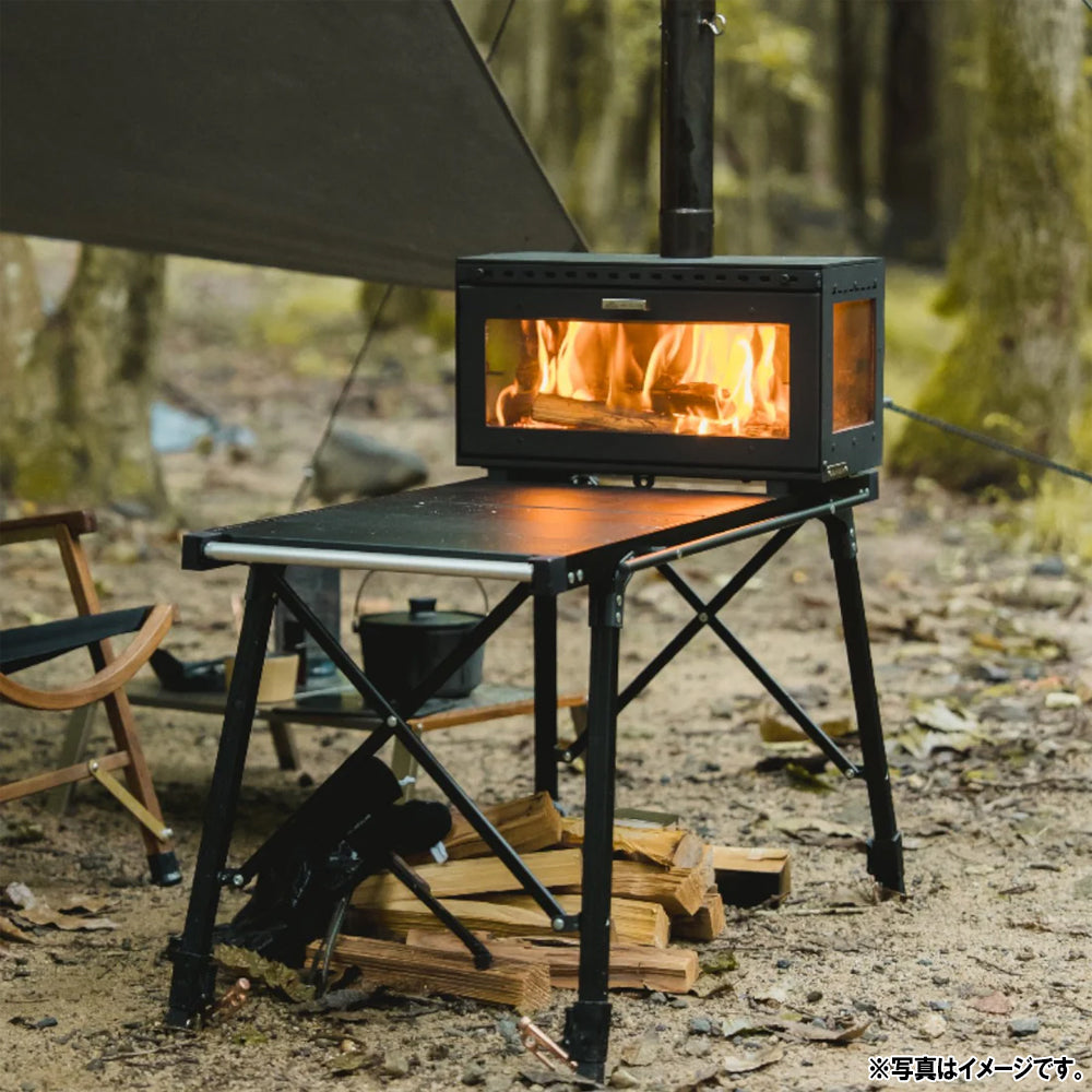 アウトドア薪ストーブ ミドラ / ミドラ ステンレスをテーブルに載せて使用することが可能。