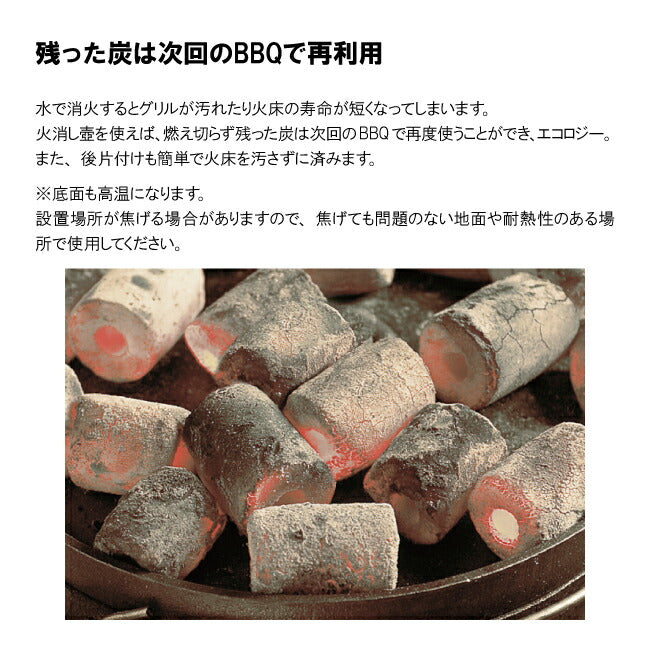 炭を消して、持ち帰る!簡単バック開閉の火消し壺。 めんどうなBBQ後の炭のかたづけが短時間ですむので、ひとつあると便利なアイテム。 火がついた炭をそのまま容器に入れてフタを閉めれば自然と消化するので、再利用することができる。 バックル式だから開け閉めも簡単で、万が一倒れても中身がこぼれないため安心。 【性能/特長】 ・炭を消して、持ち帰る!簡単バックル開閉の火消し壷。 ・炭処理に必須! ・消火に時間がかかる炭も、蓋を閉めておけば早く消せます。 ・バックル式のためワンアクションで簡単に開閉可能、蓋の固着も防げます。 ・消火後の炭や薪はそのまま持ち帰れば次回また使えます。 ・水を使わず綺麗にグリルをお掃除できます。 【総重量】 約1.4kg 【主素材】 アルミ |