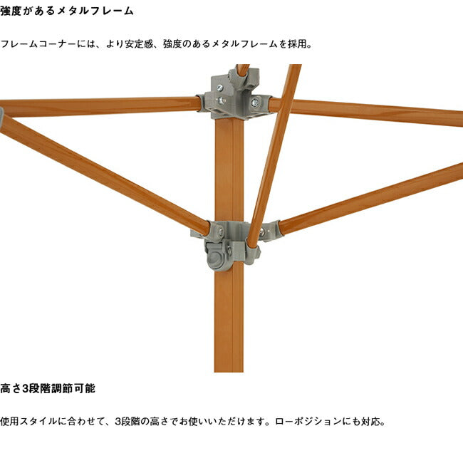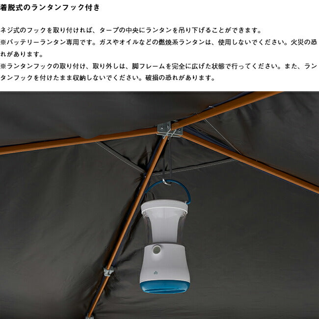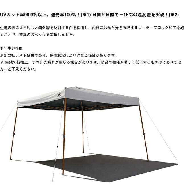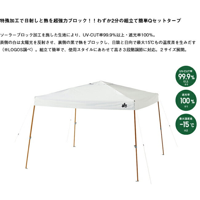 特殊加工で日射しと熱を超強力ブロック!! わずか2分の組立て簡単Qセットタープ ソーラーブロック加工を施した生地により、UV-CUT率99.9%以上・遮光率100%。 表側の白は太陽光を反射させ、裏側の黒で熱をブロックし、日陰と日向で最大15℃もの温度差を生みだす(※LOGOS調べ)。 組立て簡単で、使用スタイルにあわせて高さ3段階調節に対応。 【性能/特長】 ・シート:PU加工、ソーラーブロック加工(UV-CUT率99.9%以上、遮光率100%)、VENT TOP SYSTEM ・強度の高いポリエステルオックスフォード生地 ・着脱式ランタンフック付きなので夜でも安心 【総重量】 (約)10.6kg 【耐水圧】 1000mm 【セット内容】 シート 脚フレーム ロープ ランタンフック 収納バッグ ペグ 小物袋 【主素材】 フレーム:スチール シート:ポリオックス |