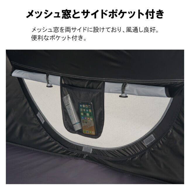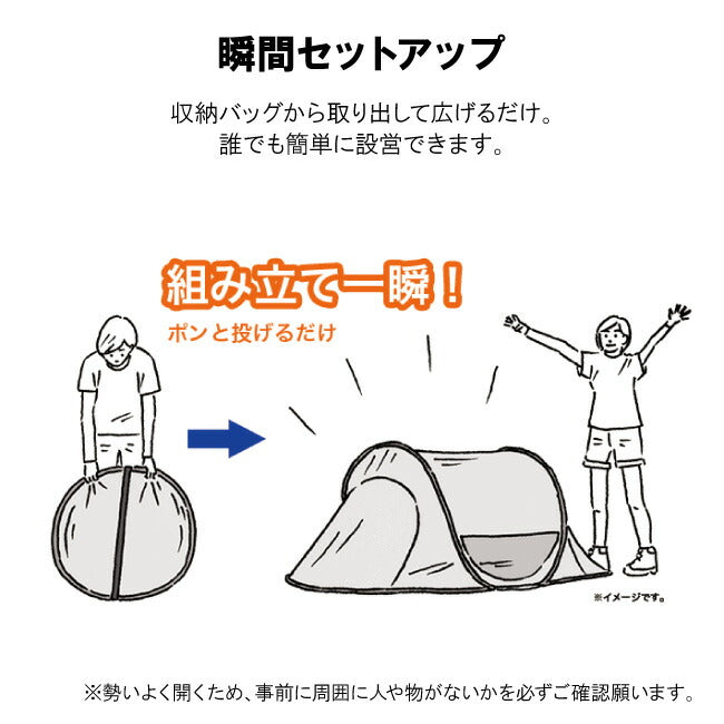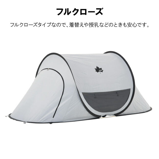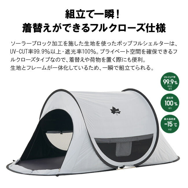 組立て一瞬! 着替えができるフルクローズ仕様。 ソーラーブロック加工を施した生地を使ったポップフルシェルターは、UV-CUT率99.9%以上・遮光率100%。 プライベート空間を確保できるフルクローズタイプなので、着替えや荷物を置く際にも便利。 生地とフレームが一体化しているため、一瞬で組立てられる。 【性能/特長】 ・フライシート:撥水加工、UV-CUT加工、ソーラーブロック加工(UV-CUT率99.9%以上、遮光率100%) ・ソーラーブロック生地採用 ・フルクローズタイプ 【総重量】 (約)2.0kg 【セット内容】 本体 ペグ 収納バッグ 小物袋 【主素材】 フレーム:スチールワイヤー フライシート:ポリタフタ フロアシート:ポリタフタ メッシュ:ポリエステル |