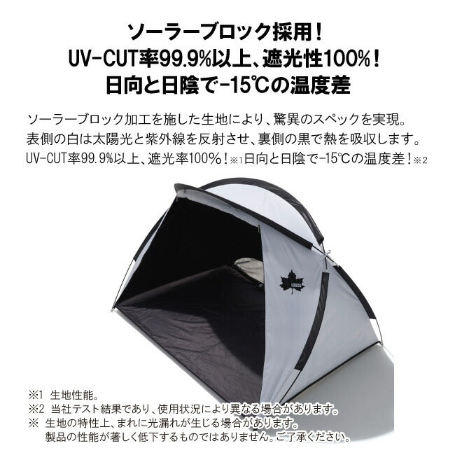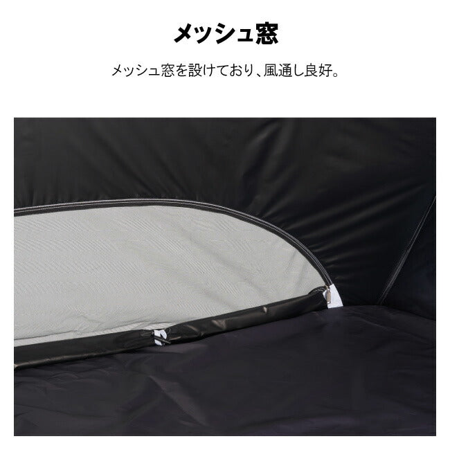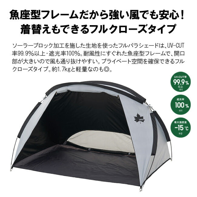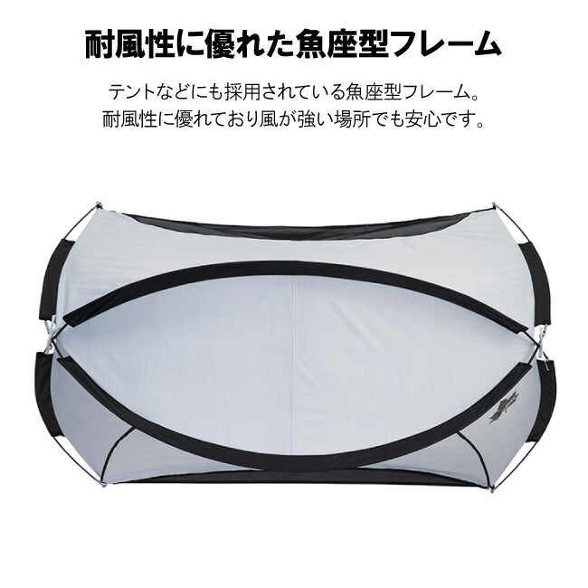 魚座型フレームだから強い風でも安心! 着替えもできるフルクローズタイプ。 ソーラーブロック加工を施した生地を使ったフルパラシェードは、UV-CUT率99.9%以上・遮光率100%。 耐風性にすぐれた魚座型フレームで、開口部が大きいので風も通り抜けやすい。 プライベート空間を確保できるフルクローズタイプ。 約1.7kgと軽量なのも◎。 【性能/特長】 ・フライシート:撥水加工、UV-CUT加工、ソーラーブロック加工(UV-CUT率99.9%以上、遮光率100%) ・ソーラーブロック生地採用 ・フルクローズタイプ 【総重量】 (約)1.7kg 【セット内容】 本体 フレーム 収納バッグ ペグ フレーム用収納袋 小物袋 【主素材】 フレーム:グラスファイバー フライシート:ポリタフタ フロアシート:ポリタフタ メッシュ:ポリエステル |