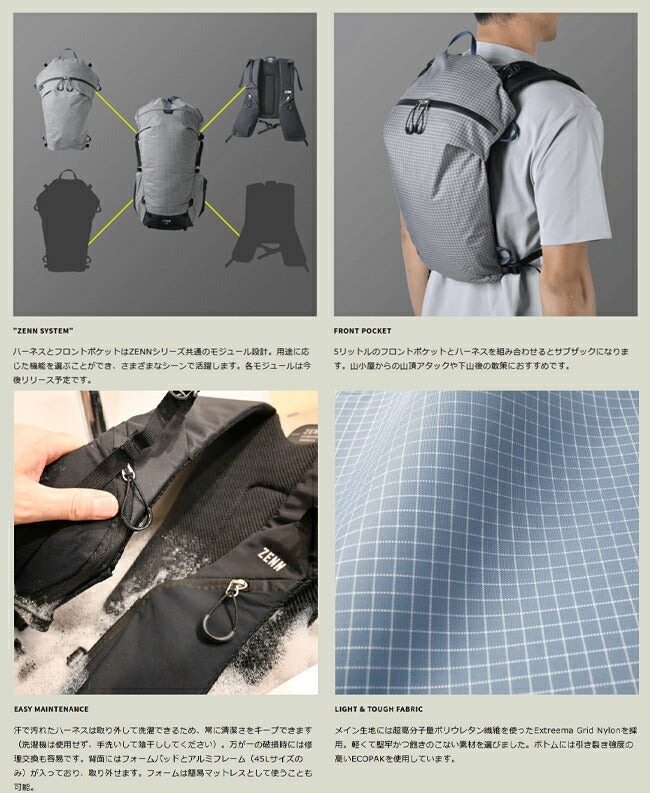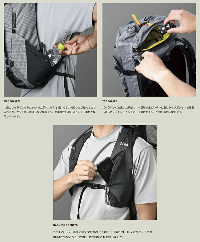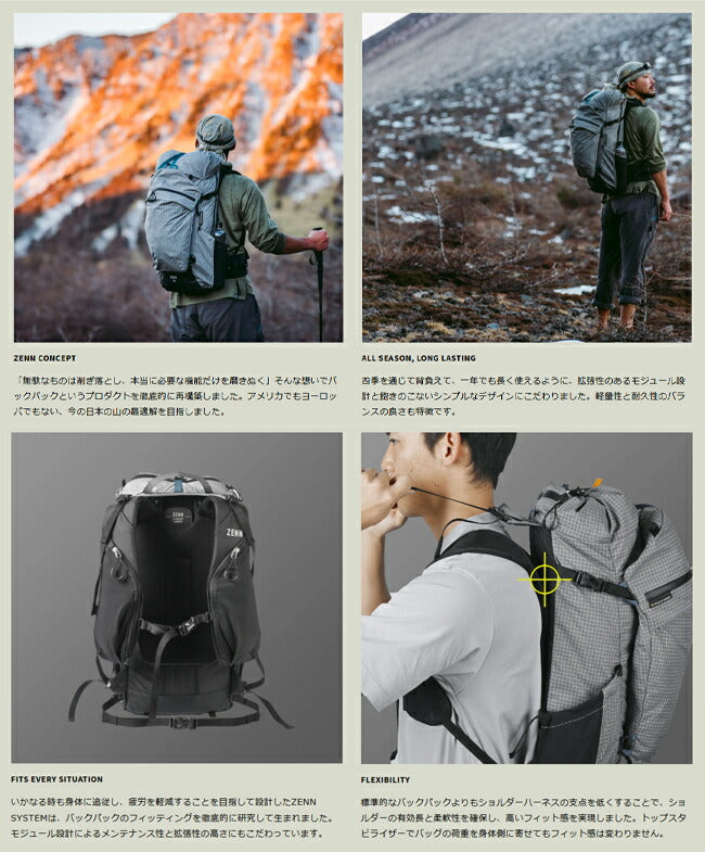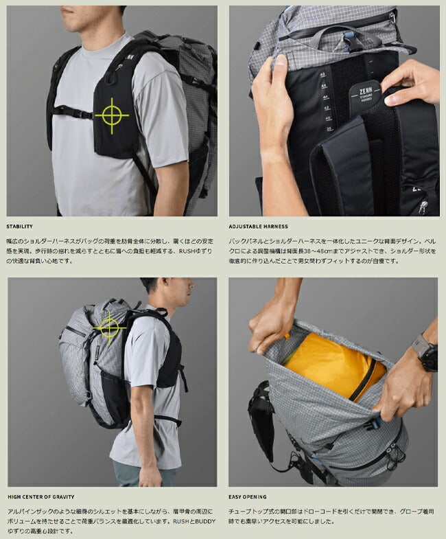 あなたの冒険を軽くする 快適な背負い心地を追求したモジュール設計のバックパックです。 【日本の山を遊び尽くす人のために】 ・ZENN CONCEPT 「無駄なものは削ぎ落とし、本当に必要な機能だけを磨きぬく」そんな想いでバックパックというプロダクトを徹底的に再構築しました。 アメリカでもヨーロッパでもない、今の日本の山の最適解を目指しました。 ・ALL SEASON, LONG LASTING 四季を通じて背負えて、一年でも長く使えるように、拡張性のあるモジュール設計と飽きのこないシンプルなデザインにこだわりました。 軽量性と耐久性のバランスの良さも特徴です。 【独創的な「ZENN SYSTEM」が身体になじむ】 ・FITS EVERY SITUATION いかなる時も身体に追従し、疲労を軽減することを目指して設計したZENN SYSTEMは、バックパックのフィッティングを徹底的に研究して生まれました。 モジュール設計によるメンテナンス性と拡張性の高さにもこだわっています。 ・FLEXIBILITY 標準的なバックパックよりもショルダーハーネスの支点を低くすることで、ショルダーの有効長と柔軟性を確保し、高いフィット感を実現しました。 トップスタビライザーでバッグの荷重を身体側に寄せてもフィット感は変わりません。 ・STABILITY 幅広のショルダーハーネスがバッグの荷重を肋骨全体に分散し、驚くほどの安定感を実現。 歩行時の揺れを減らすとともに肩への負担も軽減する、RUSHゆずりの快適な背負い心地です。 ・ADJUSTABLE HARNESS バックパネルとショルダーハーネスを一体化したユニークな背面デザイン。 ベルクロによる調整機構は背面長38〜48cmまでアジャストでき、ショルダー形状を徹底的に作り込んだことで男女問わずフィットするのが自慢です。 【「本当に必要な機能」だけを選び抜いたデザイン】 ・HIGH CENTER OF GRAVITY アルパインザックのような細身のシルエットを基本にしながら、肩甲骨の周辺にボリュームを持たせることで荷重バランスを最適化しています。 RUSHとBUDDYゆずりの高重心設計です。 ・EASY OPENING チューブトップ式の開口部はドローコードを引くだけで開閉でき、グローブ着用時でも素早いアクセスを可能にしました。 ・SIDE POCKETS 大型のサイドポケットは500mlのボトルが入る設計です。 背負った状態でも出し入れでき、かつ不意に脱落しない構造です。 耐摩擦性の高いストレッチ素材を採用しています。 ・TOP POCKET バックパックを置いた状態で、一番取り出しやすい位置にトップポケットを配置しました。 ストレートジッパーで開けやすく、小物の収納に便利です。 ・HARNESS POCKETS ショルダーハーネスにはスマホやペットボトル(500ml)が入るポケット付き。 RUSHやSNAPゆずりの使い勝手の良さを実現しました。 【重量】 本体:625g デタッチャブルポケット:85g ヒップベルト:25g 【容量】 本体:20L デタッチャブルポケット:5L 【主素材】 210D Nylon Extreema Grid 【付属品】 デタッチャブルポケット、デタッチャブルハーネス、ヒップベルト |