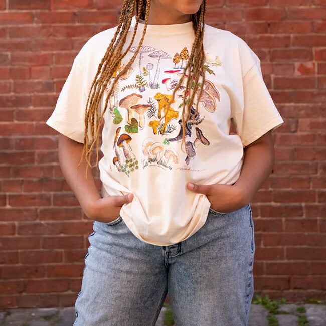 このユニークなTシャツは、真菌の魅力的な世界に敬意を表した活気に満ちた人目を引くキノコのイラストを特徴としています。