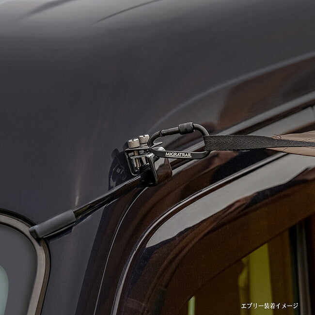 カーサイドで楽しむアウトドア、シンプルかつ堅牢なカージョイントフック。 車両のレインモール(雨どい)にタープをシンプルにしっかり取付けられる、機能的なタープ用カージョイントフック。 カーサイドでキャンプを楽しみたい人へスムーズなオーニング設置をサポート。 【特徴】 ボルトはコイン等を使用して締め付けが出来、しっかりとレインモール(雨どい)へ固定出来る。 レインモール(雨どい)の溝幅が、10mm以上の車両に取付け可能。 本体にラバーコートを施し、設置時に車両を傷付けにくい。 ジョイントとタープをしっかり連結出来るアルミニウム製カラビナを標準装備し、不意にタープが外れるのを防ぐ。 MIGRATRAILロゴのレーザーマーキングを施す。 本体とボルトはステンレス製、カラビナはアルミニウム合金製により屋外で使用しても錆びにくい。 【重さ】 1個:110g 【素材】 本体・ボルト:ステンレス カラビナ:アルミニウム合金 【表面処理】 ラバーコート・本体を取付ける前に、ラバーコートが剥がれていないかを確認してください。 ・コイン等を利用して、しっかりボルトを締め車体に固定してください。 ・強風時には使用をお控えください。 ・本品を取付けた際には、ドアとの干渉が無いかを慎重に確認してくだい。 ・干渉して車両が傷ついた場合、車両の保障はいたしかねます。 ・カージョイントフックを取付けたままでの走行は避けてください。 ・タープ等は車に対して直角に張ってください。 ・ポールと同時に使用する場合、ポールが倒れても車に接触しない位置でご利用ください。 ・本体とカラビナの接合部は構造上傷が付いてしまう場合がございます。 ・カラビナの表面はアルマイト処理のため、長時間紫外線が当たらないようご注意ください。 ・退色の原因となる場合がございます。 |