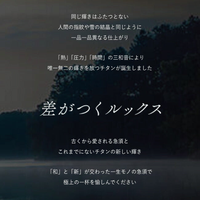 同じ輝きはふたつとない 人間の指紋や雪の結晶と同じように一品一品異なる仕上がり 「熱」「圧力」「時間」の三和音により唯一無二の輝きを放つチタンが誕生しました 【差がつくルックス】 古くから愛される急須とこれまでにないチタンの新しい輝き 「和」と「新」が交わった一生モノの急須で極上の一杯を愉しんでください 【純チタン99.7%以上 受け継がれる「一生モノ」】 SilverAntは純度99.7%以上の最高品質のチタンを調達。 チタンは厳しい使用条件・環境にも対応し多彩なメリットがある最先端の金属。 ずっと安心して使うことができます。 【優れた耐久性】 チタンの強度は鉄のおよそ2倍、アルミの3倍。 変わらない美しさと耐久性で、いつまでも極上の一杯が楽しめます。 【優しい金属】 チタンは他の金属に比べて有毒性が低く、生体適合性が良いとされています。 人や環境に優しい金属なのです。 【細部まで純チタン】 ・茶漉しもチタン 茶漉しの細部まで純チタンを採用。 輝きが散りばめられています。 飲みもの本来の味を守ります。 【重さ】 272g 【容量】 800ml 【付属品】 特製収納ポーチ |