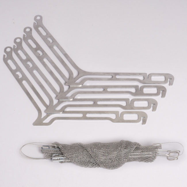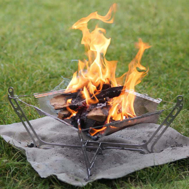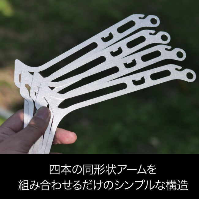 高耐久性メッシュ仕様 分割収納式焚き火台 耐久性の高いステンレスリングメッシュを用いた焚火台のシンプルバージョン。 四本のアームを組み合わせるだけで簡単に組み立てられます。 ロースタイルとし耐荷重を下げることで、構造を単純化。 重量とコストを削減。 簡易版ながら火床は上位モデルと共通、焚き火を存分に楽しむ事ができます。 五徳アタッチメントも取り付け可能です。 【重量】 本体:800g 【積載重量】 3kg 【材質】 ステンレススチール |