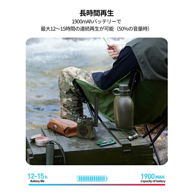 ・音楽・情報・灯り・充電の4つの機能をこの一台に。 災害時にも頼れる、多機能ポータブルスピーカー。 ・手のひらサイズでも音は本格派。 ミリタリーデザインで、アウトドアや日常にもぴったり! ・高級感あるしっかりとしたパッケージで、ギフトとしても喜ばれるデザインとクオリティ。 今回のWild Mini第三世代も、MUZENらしいディテールの美しさと多機能性が光る逸品です。 「音楽を持ち歩く」だけでなく、「災害時に頼れる」「贈り物として喜ばれる」スピーカー。 それが、MUZEN Wild Mini 第三世代です。 1、ミリタリーデザイン 無骨でありながら洗練されたミリタリーテイストの外観は、様々なシーンでマッチ。 自然と調和し、アウトドアでも映える存在感です。 2、IPX5の耐水性 突然の雨や水しぶきにも安心。 IPX5相当の耐水性能で、キャンプ・BBQ・釣りなど、さまざまなアウトドアシーンで大活躍します。 3、懐中電灯機能(強・弱・SOS信号) スピーカー上部には3つのモードに対応したLEDライトを搭載。 夜間の使用や災害時のSOS発信にも使える実用的なライトです。 4、バッテリー容量1900mAhにグレードアップ 第二世代に比べ約1.9倍のバッテリー容量を実現。 音楽再生はもちろん、LEDライトやFMラジオ使用時も安心の持続力です。 5、FMラジオ機能 携帯圏外でも電波が届けばラジオが聴ける! アウトドアや防災用途での情報収集に重宝する新機能です。 6、非常時、モバイルバッテリーとしても使用可 USB接続でスマホや他の電子機器へ給電可能。 停電時や災害時の「もしも」に備える一台としても大活躍。 7、クリアな音質で臨場感アップ 小型でもこもらない高音質。 野外でも室内でも、クリアでパワフルな音をしっかり楽しめます。 8、安定接続のBluetooth5.0搭載 最新のBluetooth5.0により、安定したワイヤレス接続と低遅延で快適なリスニング体験を実現。 【重量(本体のみ)】 約276g 【Bluetooth通信距離】 5m以上10m以下 【スピーカー】 4Ω5W 【アンプパワー】 5W 【SNL比】 >70dB 【システム周波数応答】 80Hz〜18Hz 【MIC使用距離】 <0.05m(注意:周辺環境が静かな場合) 【電池】 3.7V/1900mAh 【充電口】 Type-C 【充電/出力電圧】 DC 5V 1A 【セット内容】 ・スピーカー 本体×1個 ・アンテナ×1本 ・Type-C充電ケーブル×1本 ・取扱説明書×1冊 ・オリジナル紙バッグ×1個 |