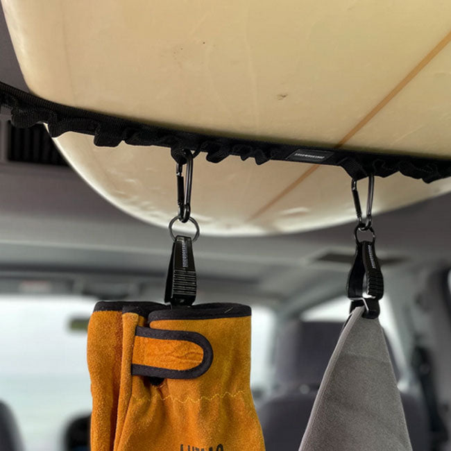 愛車でのトリップ時、自分だけの空間と時間をカスタマイズするハンギングベルトにカラビナクリップがあれば、タオルやグローブ、水着などいろいろなアイテムを挟んで吊るす事ができます。