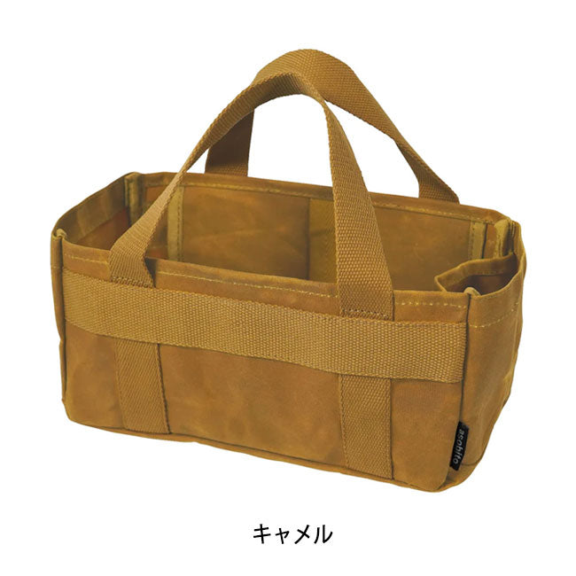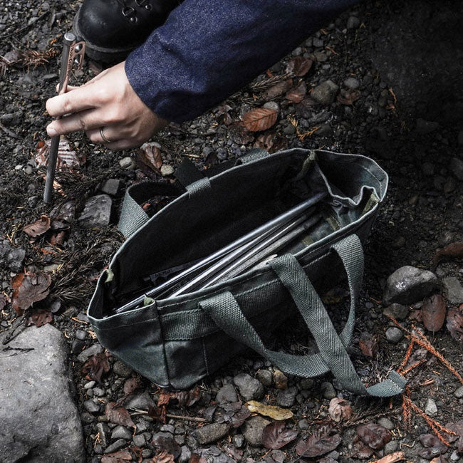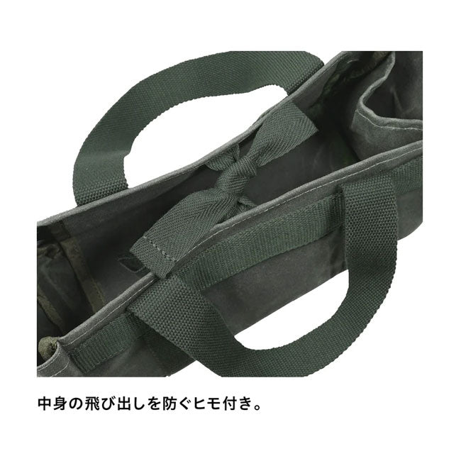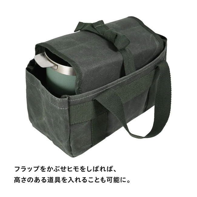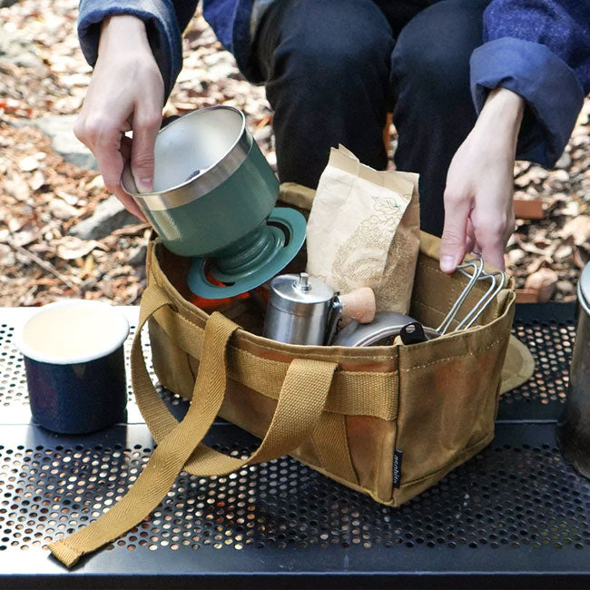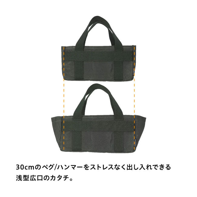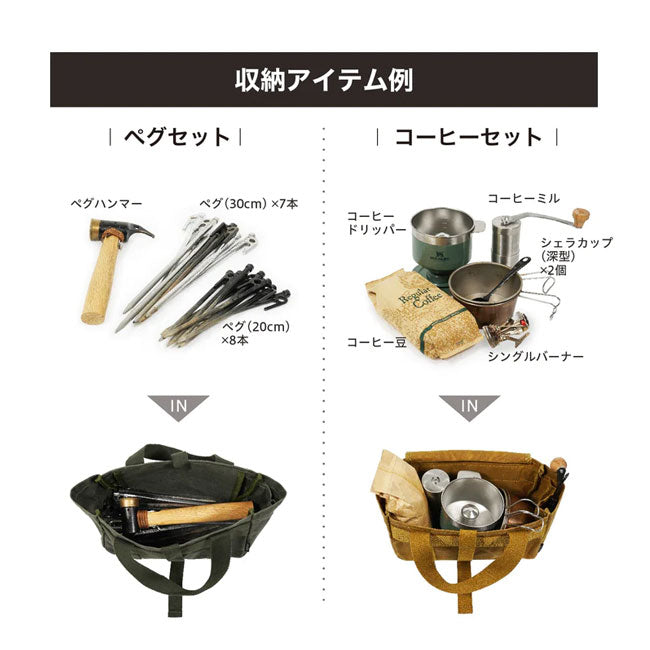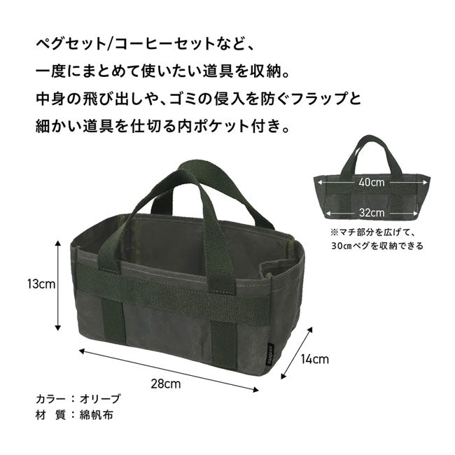 ペグセット/コーヒーセットなど、一度にまとめて使いたい道具を収納 ●細かく散らばりがちな道具をまとめて収納。 「あれどこにあったっけ?」をなくします。 ●浅型広口のカタチは収納した道具の一覧性に優れ、出し入れのストレスを感じません。 ●中身の飛び出しや、ゴミの侵入を防ぐフラップ。 フラップをしっかりと固定できるヒモ付き。 ●シングルバーナーやコンパクトナイフなど他の道具を傷つけやすい細かい道具の収納に便利な内ポケット。 ●マチを広げれば30cmのペグ/ハンマーを収納可能。 ●フラップをかぶせヒモを結べば道具の汚れと落下防止に。 【耐荷重】 10kg 【重量】 約240g 【素材】 本体:コットン100%(パラフィン加工) 持ち手:ポリエステル100% |