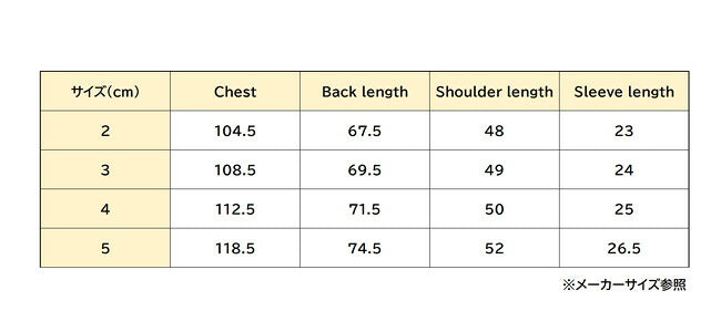 サイズ | 2:Chest104.5 Back length67.5 Shoulder length48 Sleeve length23 3:Chest108.5 Back length69.5 Shoulder length49 Sleeve length24 4:Chest112.5 Back length71.5 Shoulder length50 Sleeve length25 5:Chest118.5 Back length74.5 Shoulder length52 Sleeve length26.5 (単位:cm) ※メーカーサイズ参照 |