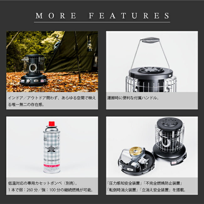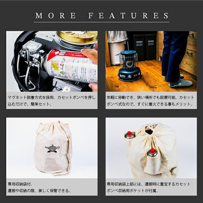 90年以上前から変わらない完成されたデザインと、特徴的で美しい青い炎。 心地良い暖かさと取り扱いの容易さが人気の、アラジン ブルーフレームヒーター。 この人気のストーブをモチーフとしたガスストーブが【アラジン ポータブルガスストーブ】。 炎を中央に集めるトルネードバーナーは効率良く熱を発生し、暖かい空気を周囲へと広げる。 カセットボンベ燃料で小さい本体シルエットは、携行しやすく、場所を選ばず使いやすい。 そんなモデルをベースに、別注モデル【マットブラックエディション】が完成。 アラジンへのリクエストから製品化までに約3年を要したマットブラックカラーは、重厚かつ、クールでスタイリッシュ。 所有欲を満たす至高の逸品。 点灯装置:圧電点火方式 ボンベ着脱:マグネット式 |
