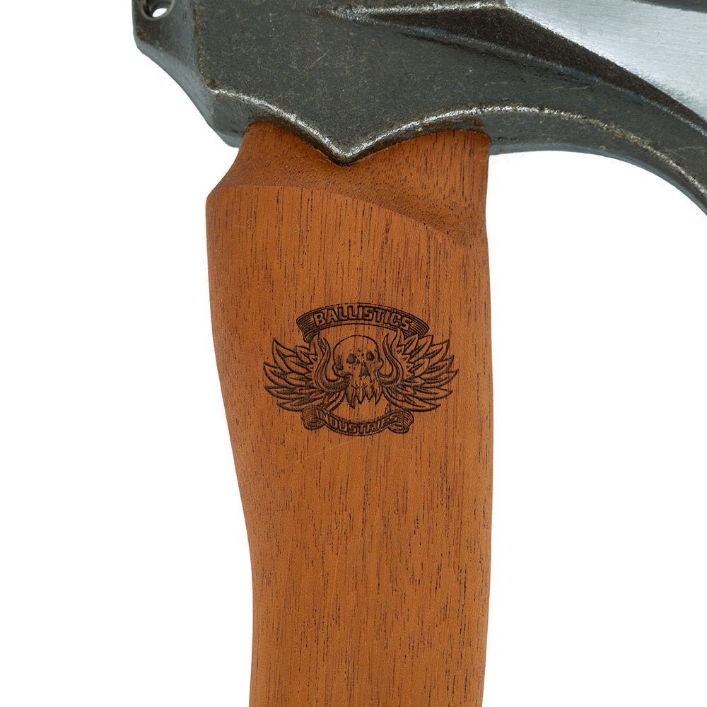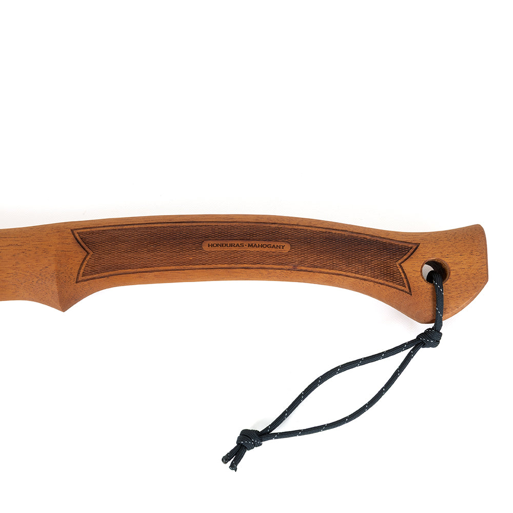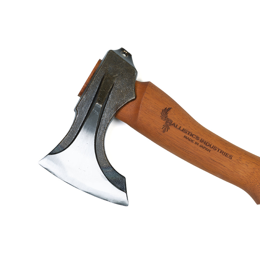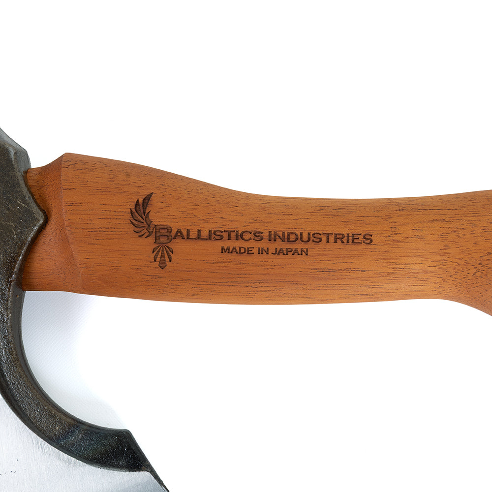 | 前回もハンドリングを担っていただいたNERUDESIGNWORKSさんのご協力を得て、今回新型を斧刃からデザインし、鍛造製作することといたしました。 焚き付け用の手斧は既にあるので、次の1本は薪割りが出来る中型サイズを前提に、ヘッド重量1kgを目指してシャープさを強調したデザインのヘッドといたしました。 それに合わせた柄(ハンドル)は流れるようなS字曲線と力強さを併せ持った骨太のデザインにしました。 中間位置の突起は、握る際の指掛かりとスライドストッパーを併せ持った、ナイフ用語でいうフィンガーグルーヴになります。 柄の素材には、フィリピンやアフリカも産地ではありますが、中でも真正マホガニーともうたわれる「ホンジュラスマホガニー」をラインナップいたしました。 マホガニーには、数あるガンメーカーの中でも有数の加工技術や独自の拘りに定評のあるガンマイスター「CAW(CRAFTAPPLEWORKS)」さんのご協力のもと、ガングリップの手法としては定番のチェッカリング加工(詳しくはCOLTガバメントと同じダイヤパターン)とレーザー刻印を施していただき、強力な滑り止めを兼ねた装飾としています。 ソングホールに通したパラコードは不意に落とす事のないよう手の平を通せるループ長としています。 最後に、斧刃後部の穴は柄のソングホールとの間にパラコードなどを渡していただく事により、肩掛け出来るようにする為と、穴に紐でループを作っていただく事によりヘッドを上にしての収納やディスプレイを可能とする為のものになります。 【重さ】 全体重量:約1300g 斧刃部分:約990g 【素材】 斧刃:鋼 ハンドル:マホガニー カバー:コーデュラナイロン(カバーのカラーはアソートになります。※お選びいただけません。) ※ナイフ刃物類の販売に関して -ナイフ・刃物類は18歳未満の方へは販売しておりません。 -刃物を正当な理由なく携帯するくことは法律によって禁止されています。 -販売は登山・キャンプなど正当な仕様目的を有した方のみとさせていただきます (銃砲刀剣類所持等取締法第22条) |