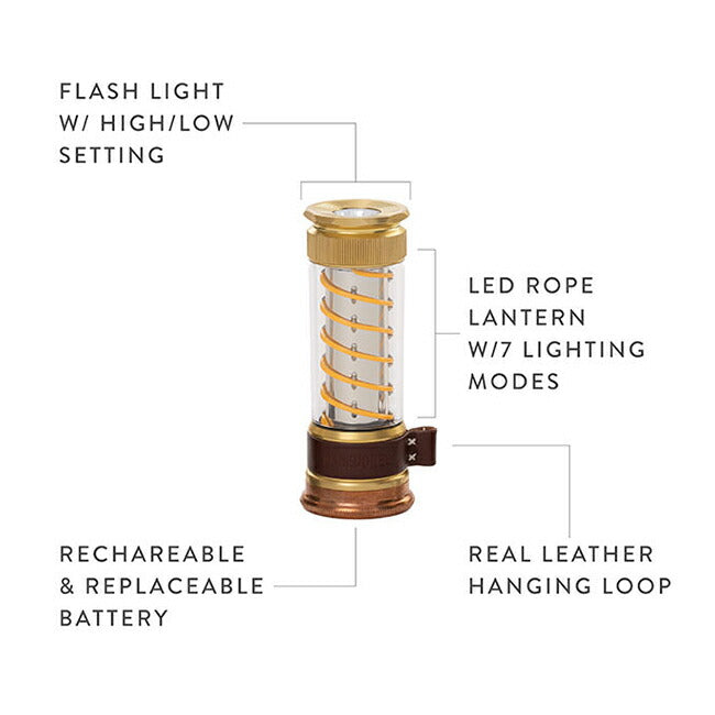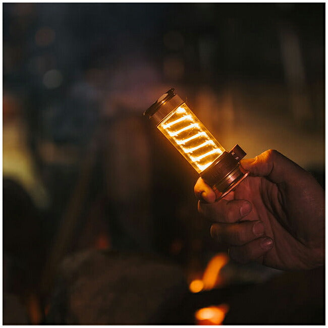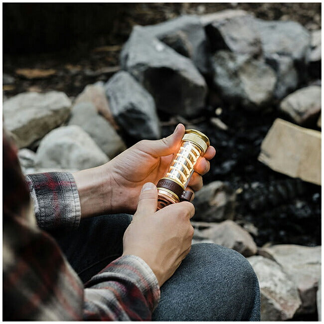 ロープ状のLEDを採用したスティック状の小型ライトです。 ベース部分に磁石が内蔵されより使い易くなりました。 ハンドライト、ランタンとして使用できるユニークなランタンで、リチウムバッテリーを内蔵しており、繰り返し使用可能です。 真鍮と銅からなる製品の表面は、時が経つにつれ表面がゆっくりと経年変化し、美しく、豊かで、個性的な外観になります。【注意】 ご購入後、バッテリーを入れる際には、説明書に沿って、フラッシュライトレンズエンドキャップ側を回してバッテリーを挿入してください。 その際、締めすぎないようにしてください。 また、ライトセレクターノブ(スイッチ)側を間違って強く回したり、分解をしますと、ライトの破損に繋がりますので、ご注意ください。 【ライトスティックモード】 [明るさ] Lowパワー:9-12lm、Hiパワー:90-120lm [連続点灯時間] Lowパワー:20時間、Hiパワー:7時間 [発光色] 暖色 2100-2400K 【フラッシュライトモード】 [明るさ] Lowパワー:11-15lm、Hiパワー:115-145lm [連続点灯時間] Lowパワー:60-80時間、Hiパワー:6-8時間 [発光色] 暖色 2800-3300K 【バッテリ−】 LI-ION 18650 | 2200mAh 3.7V 8.14Wh 【充電方式】 USB-C充電 【充電時間】 4-5時間 【素材】 真鍮、銅、ポリカーボネート、レザー 【重量】 228g |