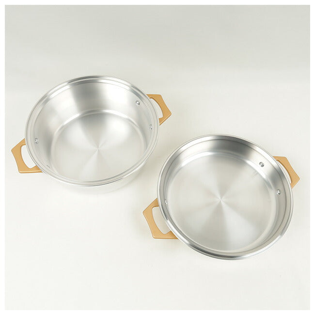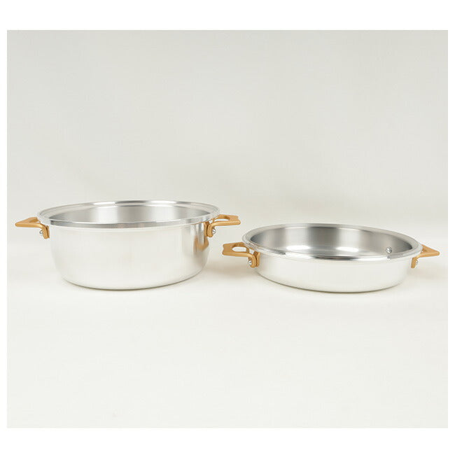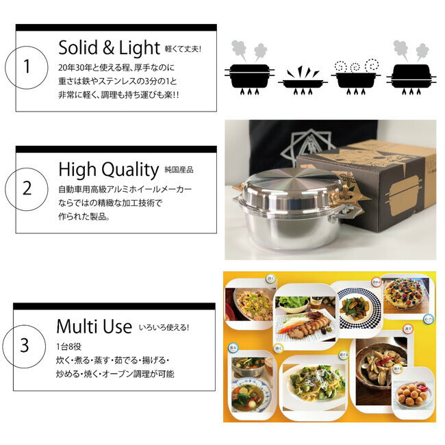 無水調理鍋は、健康志向の高まりも見られるようになり注目をあびているお鍋です。 特に、社会情勢により、外食より自宅での食事が増えているなか、栄養価を逃さず、調理時間を短縮できる無水調理は注目度バツグン。 さらに、この【POD+PAN】は蒸す、煮る、ゆでる、炊く、炒める、焼く、揚げる、天火をこなします。 また、耐久性があるので、親子三代で使って頂きたい。 重さ:1.94KG 材質:アルミ合金展伸材 容量:本体2.4L 蓋1.0L お米3合まで 直火専用(オーブンでの使用可) |