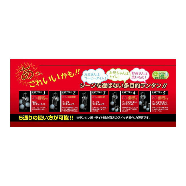 5通りの使い方が可能。ライトは取り外し可能。 材質(品質) 本体:ABS樹脂、ホヤ:ポリスチレン、持ち手:鉄(クロムめっき) 仕様/その他 光源:LED(発光ダイオード)70個 電源:ランタン=DC6V 単1形乾電池4個使用(別売) ライト=DC4.5V 単4形乾電池3個使用(別売) 電池寿命:LED15灯(ランタン)=連続約50時間、LED30灯(ランタン)=連続約25時間、LED5灯(ライト)=連続約20時間、LED15灯(ライト)=連続約7時間(アルカリ乾電池使用時)*使用状況により異なります。 |