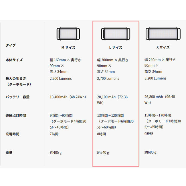まだまだ進化を続けるULTRAシリーズ。 最大の明るさ3,200Lm。 手軽に持ち運べるコンパクトなボディでありながらも、秘めたるパワーは本物。 キャンプ用の長時間点灯ランタンとしてはもちろん、 スマホなどへの充電も可能なモバイルバッテリー機能を搭載していることから、災害時などの非常用としても、 活躍する代表モデルです。 【重量】 約540g 【バッテリータイプ】 リチウムイオン電池 【バッテリー容量】 20100mAh(72.36Wh) 【最大の明るさ(ターボモード)】 2,700Lumens 【連続点灯時間】 13時間〜120時間 (ターボモード6時間30分〜60時間) 【色温度】 電球色(Warm):3,000K(±15%) 昼白色(Bright):4,200K(±15%) 昼光色(Cool):6,500K(±15%) 【USB入出力】 出力:USB 5V 2A/9V 2A/12V 1.5A 入力:USB 5V 2A/9V 2A/12V 1.5A 【充電時間】 8時間 【防水防塵】 IP 54 【付属品】 USB Type-C充電ケーブル ランタンハンガー(Sフック)2個 専用ハードケース |