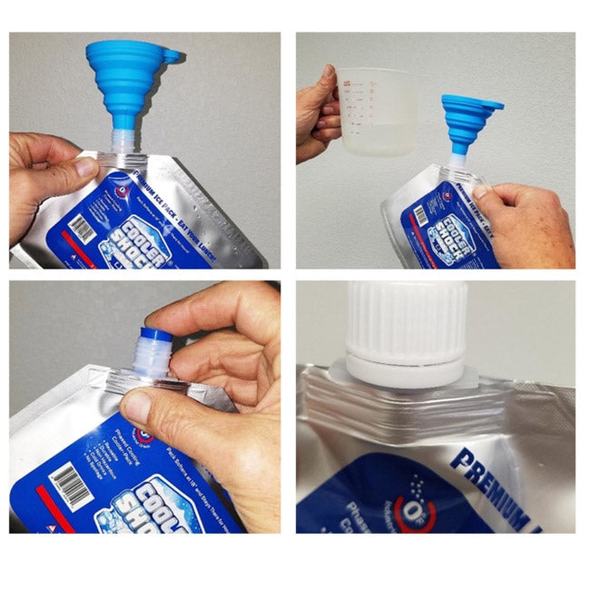 COOLER SHOCKは医療分野である血液輸送のために開発された技術を応用して生まれました。 血液の輸送には規定の温度を長時間維持すること、血液の成分が変化しないことが求められます。 パッケージは熱伝導率に優れたアルミニウムと剛性に優れたポリエチレンとナイロンの3層でできており、厚みはわずが約0.2mmです。 これにより内部の冷えた温度を効率的に外部に放出します。 クーラーショックは-7.8℃を長時間維持する保冷剤として設計されています。 氷もCOOLER SHOCK含む保冷剤(アイスパック)もそれ自体の温度は冷凍庫の温度(0〜-12.2℃)で始まり、 冷凍庫から出した時点で温度が上がっていきます。 氷は速く温度が上がり、0℃になってやがて溶けていきますが、Cooler Shockは-7.8℃をキープするように作られているため、クーラーボックス内の保冷効果も長時間キープできます。 COOLER SHOCKは氷と比較した場合、同じ保冷力に必要とする量も少なくて済むので、クーラーボックスの重量は軽減され、スペース効率も向上します。 また、自宅に帰ってからも冷凍庫に戻すだけなので、片づけの手間も軽減されます。 【使用方法】 1.アイテム別に必要な水道水をクーラーショックに注ぎます。 Large Pack:56oz = 約1.65l Mid Pack :28oz = 約828ml Small Pack:12oz = 約355ml 2.空気を抜きながら、付属のシリコンコルクで栓をします。 3.ネジキャップを隙間が無くなるまでしっかり締めます。 ※その際、半透明の注ぎ口の根元に達するように締め込みます。 4.冷凍庫に最低8時間は入れて完全に凍らせてお使いください。 |