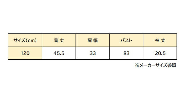 サイズ | 120cm:着丈:45.5cm/肩幅:33cm/バスト:83cm/袖丈:20.5cm ※メーカーサイズ参照 |