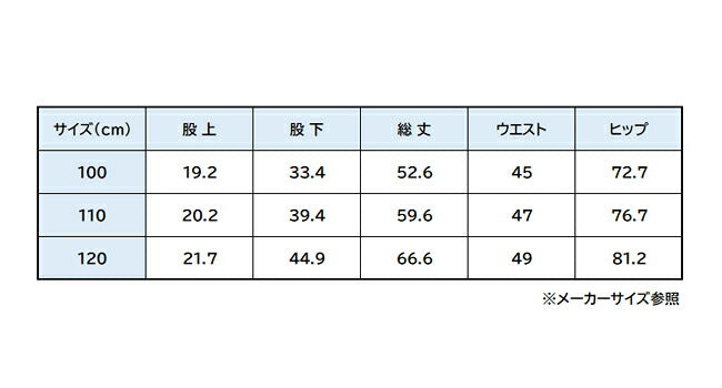 サイズ | 100cm:股上19.2cm 股下33.4cm 総丈52.6cm ウエスト45.0cm ヒップ72.7cm 110cm:股上20.2cm 股下39.4cm 総丈59.6cm ウエスト47.0cm ヒップ76.7cm 120cm:股上21.7cm 股下44.9cm 総丈66.6cm ウエスト49.0cm ヒップ81.2cm ※メーカーサイズ参照 |