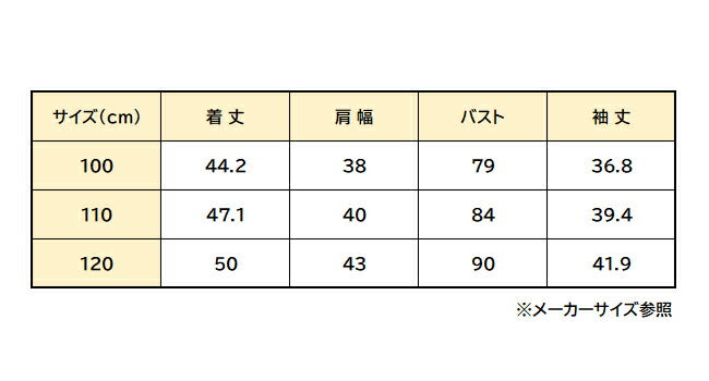 サイズ | 100:着丈44.2 肩幅38 バスト79 袖丈36.8 110:着丈47.1 肩幅40 バスト84 袖丈39.4 120:着丈50 肩幅43 バスト90 袖丈41.9 (単位:cm) ※メーカーサイズ参照 |