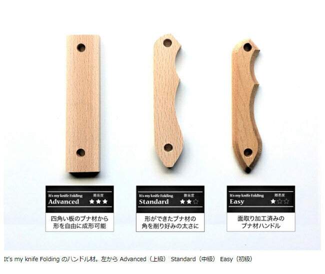 古くなったら、新しいものを買えばいい。 壊れてしまったら、新しいものを買えばいい。 そんな価値観が浸透してゆくとともに、ひとつのものを長く使うことがめっきり減ってしまった今、私たちが提案するのは、オリジナルナイフキット「It's my knife」です。 It's my knife Folding Easyは塗装やウッドバーニングといったカスタマイズを楽しむことを主眼においた、今までにない新しいコンセプトのナイフキット。面取り加工が施されており、組み立てるだけでも完成できる手軽さもポイント。 アウトドアでの調理シーンを想定して開発されたこのナイフ、 ハンドルを作り上げる楽しさはもちろん、使い勝手も細部まで工夫が施された 本格派の折りたたみナイフです。 【特長】 ・鋼には高級鋼として有名な安来鋼の青紙を、そして地金にはステンレスを採用しており切れ味抜群。 研ぎやすくて長切れする本格派のブレードです。 (安来鋼の青紙は、水分をしっかり除去せず放置すると錆が発生することがあります。) ・ブレード以外の金属パーツはすべてステンレス製で錆びにくく、また分解可能なので、メンテナンス性に優れています。 ・ブレードとハンドルの間に皿ばねを仕込んでいますので、ねじの締め具合で刃が回転する硬さを自由に調整することができます。 ・具材を切るとき力を入れやすくするように、ブレードを絶妙なバランスで後ろに反らしてあります。 それにより切断時に持ち手が刃先より高い位置にくるので、切断部に力がかかりやすくなっています。 【内容】 ブレード:1本 ハンドル材(ブナ):1組 板ドライバー:1枚 サンドペーパー(#120,#240):各1枚 組ねじ:2組 皿ばねとワッシャー:各2枚 ピン:1本 つくりかた説明書 ※ナイフ刃物類の販売に関して -ナイフ・刃物類は18歳未満の方へは販売しておりません。 -刃物を正当な理由なく携帯するくことは法律によって禁止されています。 -販売は登山・キャンプなど正当な仕様目的を有した方のみとさせていただきます (銃砲刀剣類所持等取締法第22条) |